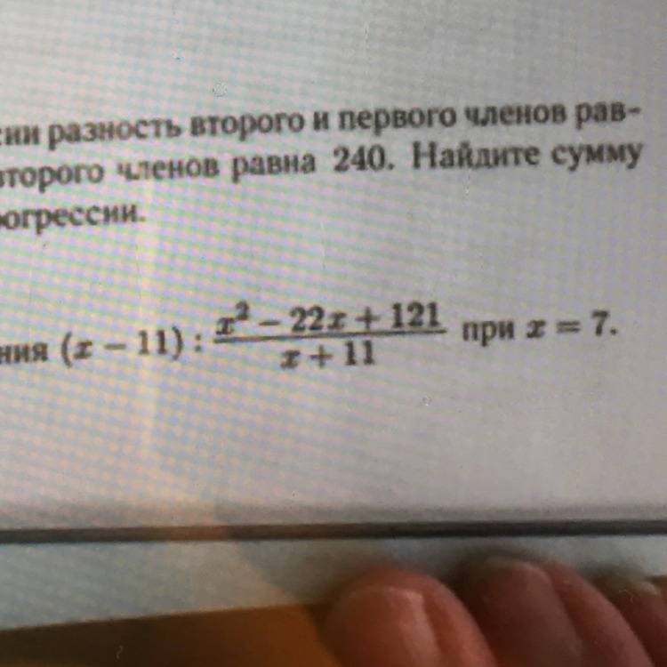 x-11 представляешь как дробь x-11/1. Делишь на вторую дробь и получаешь x²-22x+121/(x-11)*(x+11). x²-22x+121= (x-11)² Получается x-11/x+11 А дальше подставляешь 7