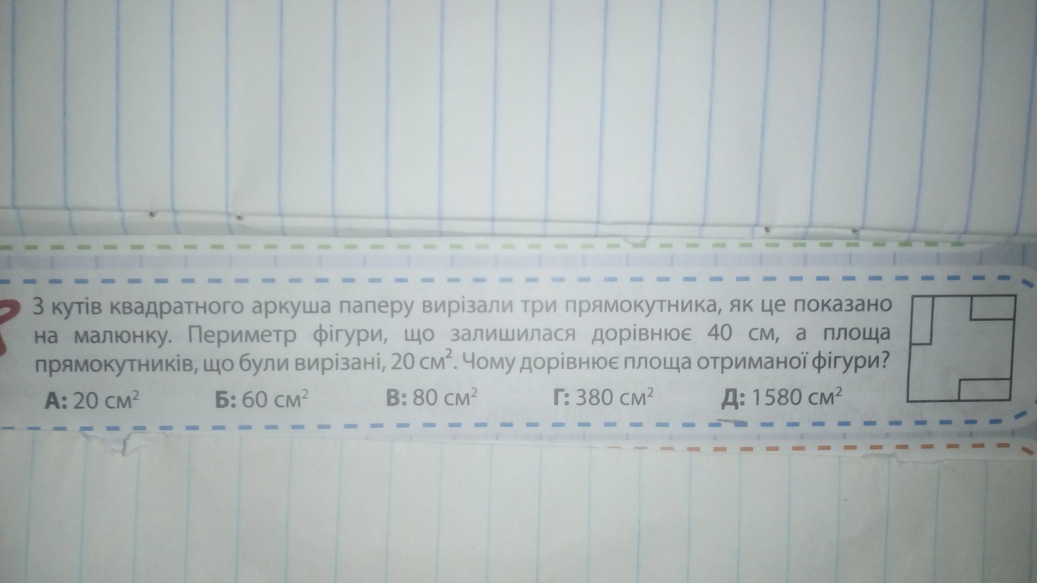Периметр фигуры,что осталась равен 40 см,а площадь прямоугольников,что были вырезаны,20 см квадратных.