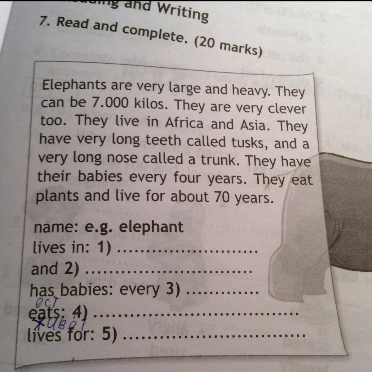 riting 7. Чтение и полной. (20 баллов) Слоны очень большие и тяжелые. Они могут быть 7.000 кг. Они умны очень тоже. Они живут в Африке и Азии. Они имеют очень длинные зубы, называемые клыки, и очень длинный нос называется ствол. У них есть своих детей каждые четыре года. Они едят растения и живут около 70 лет. Имя: например, слон живет в: 1) ......................... и 2) имеет детей: каждый 3) .......... .. живет. 5) ..............................