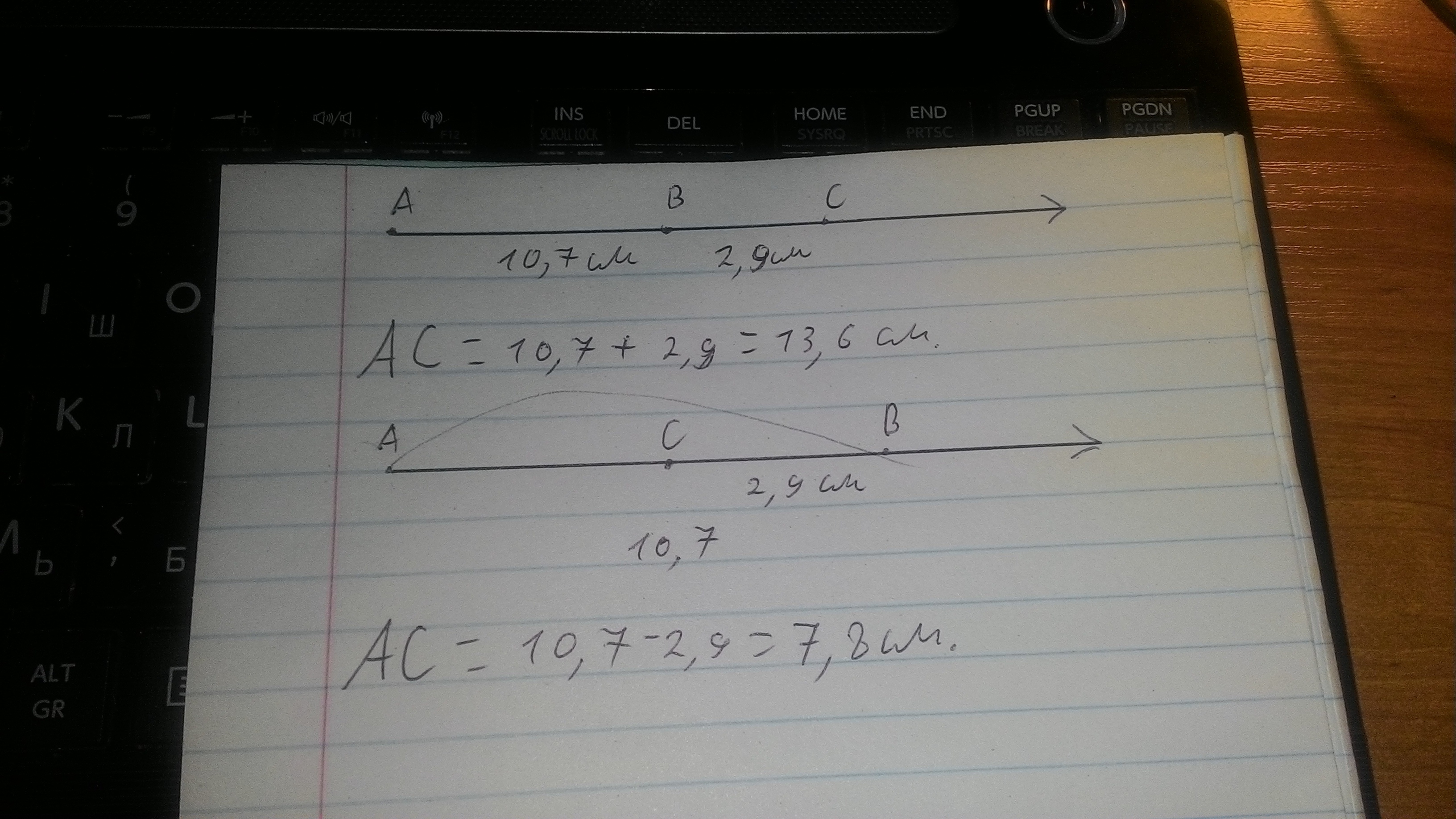 на луче с началом в точке а отмечены точки в и с известно что ав=10.7см вс=2.9см какую длину может иметь отрезок ас?