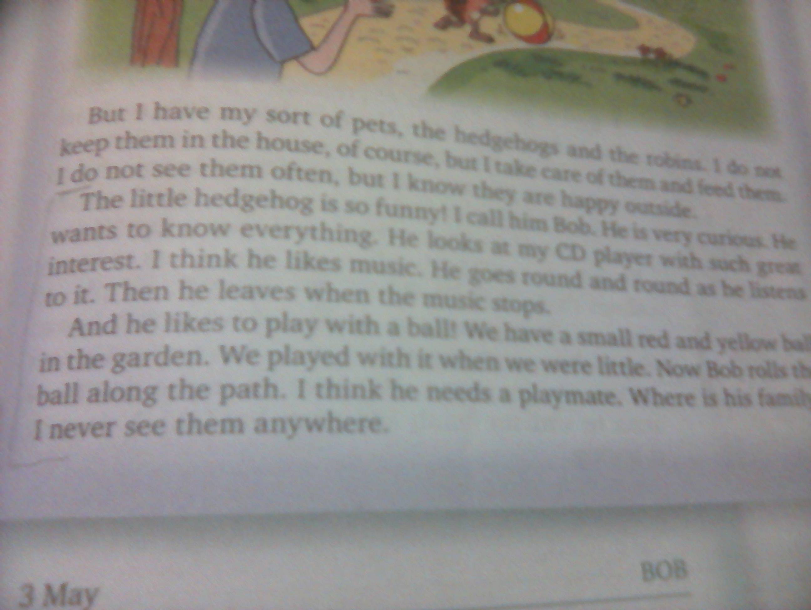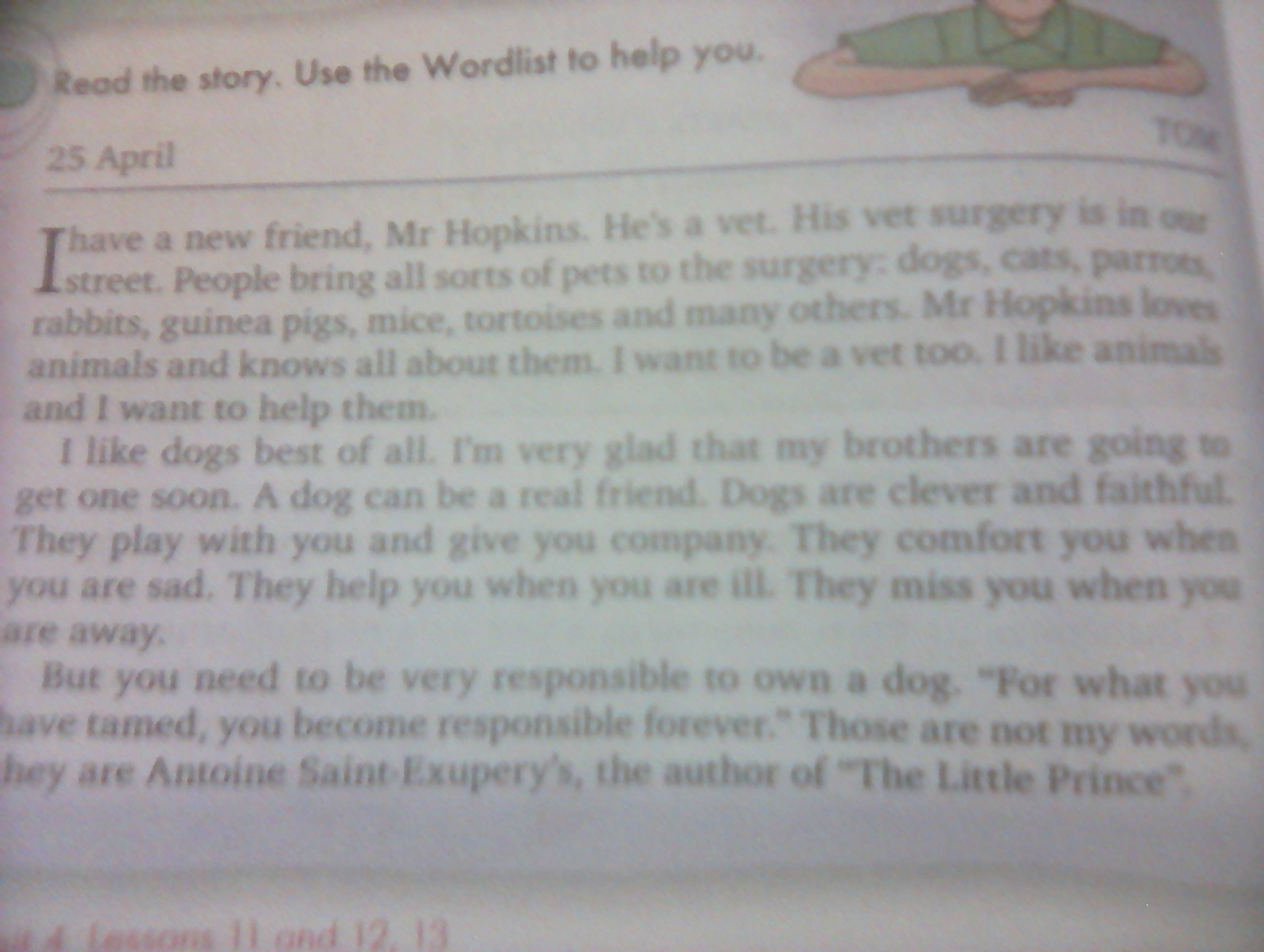 У меня есть новый друг, мистер Хопкинс. Он ветеринар. Его ветеринарная лечебница находится на нашей улице. Люди приносят разных животных в лечебницу: собаки, коты, попугаи, кролики, морские свинки, мышей, черепах и многих других. Мр. Хопкинс любит животных и знает о них всё. Я тоже хочу стать ветеринаром. Я люблю животных и хочу помогать им.