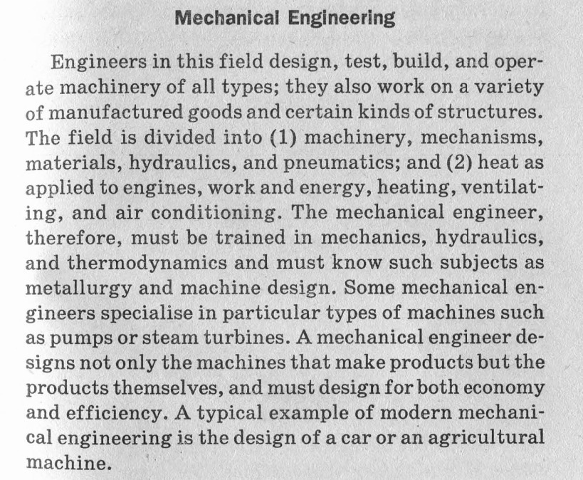 Инженеры в этой области дизайна, тестирования, сборки и лям управлять машин всех типов; Кроме того, они работают на разнообразных промышленных товаров и определенных видов структур. Поле делится на (1) машины, механизмы, материалы, гидравлики, пневматики и; и (2) тепла применительно к двигателям, работы и энергии, отопления, ventilat- ния и кондиционирования воздуха. Инженер-механик, следовательно, должны быть обучены в области механики, гидравлики и термодинамики и должны знать такие предметы, как металлургия и дизайн машины. Некоторые механические ан специализируются на саперных отдельных видов машин, таких как насосы или паровых турбин. Инженер-механик умень- признаки не только машины, которые делают продукты, а сами, и должны разрабатывать как для экономии и эффективности продукции. Типичным примером современного механического рассмотрения техники является конструкция автомобиля или сельскохозяйственной