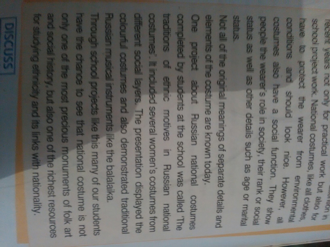 Через школьные проекты, такие как этот, у многих наших студентов есть шанс увидеть, что национальный костюм не только один из самых драгоценных памятников народного творчества(народного творчества = фольклора) и история общества, но и один из богатейших источников для изучения этнической принадлежности и её связью с национальностью.