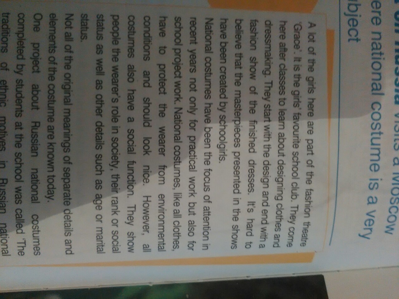 Много девочек тут являются частью модного театра "Грэйс". это любимый школьных клуб девочек. Они приходят сюда после уроков, чтобы узнать о дизайне одежды и о том, как ее делать. Они начинают с дизайна и заканчивают показом мод(фэшн шоу) законченных(готовых) платьев. Трудно поверить, что эти шедевры представленный на показе(шоу) сделаны школьницами. Последние годы всё внимание было сконцентрировано на национальных костюмах не только для практической работы, но и для работы над школьным проектом. Национальные костюмы, как и вся одежда, должны защищать того, кто носит от погодных условий и так же должны выглядеть хорошо. Однако, все костюмы имеют и общественную функцию. Они показывают людям роль в обществе человека, который их носит, его звание или социальный статус так же как и другие детали : возраст или семейное положение.