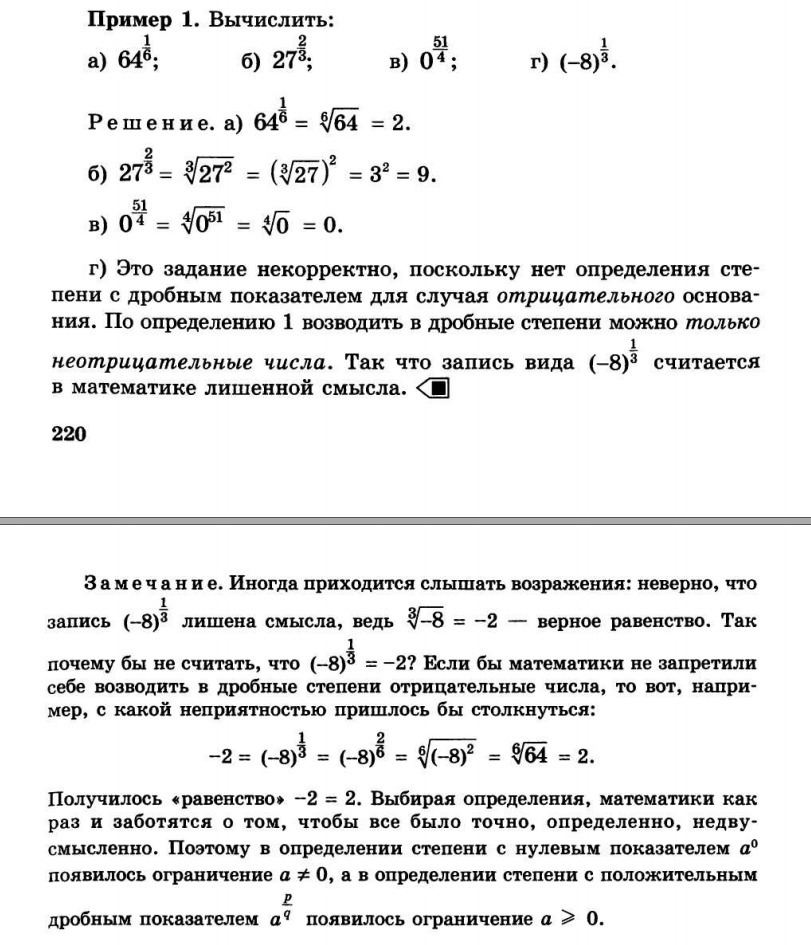 P.S. На всякий случай присоединяю скрин из учебника, в качестве подтверждения моих слов про область определения степенной функции с дробным показателем. Обратите внимание на упражнение г) и на замечание ниже.