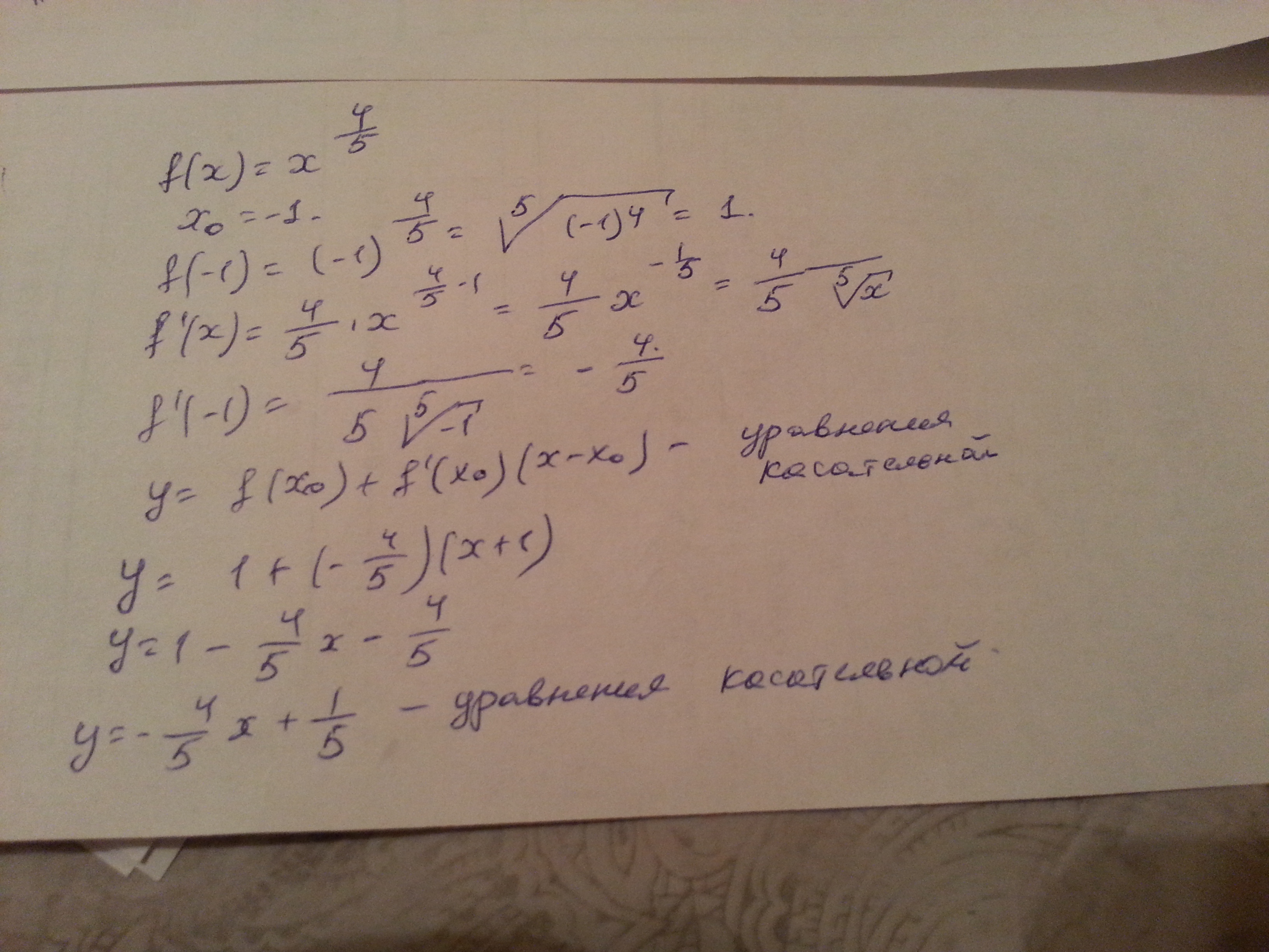 y=4(x-1)/5+1, т.е. y=4x/5+1/5. Очевидно, точка М(-1; -3/5) лежит на касательной. Итак, прямая c уравнением y=4x/5+1/5 является касательной к графику функции f(x)=x^(4/5) и проходит через точку M(-1;-3/5) c абсциссой -1 (хотя сама точка М не лежит на графике). Понятно, что таких точек можно найти сколько угодно, т.к. можно брать любые касательные. В такой постановке задача, конечно неинтересна. Собственно поэтому я и думаю, что в условии ошибка.