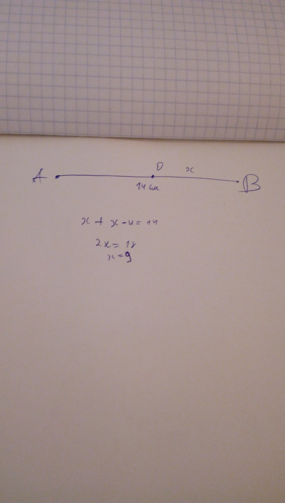 Начерти отрезок АБ длинной 1дм 4см. Отметь на нем точку О так, чтобы длинна отрезка АО была на 4 см меньше длинны отрезка ОБ..задача 2класса можно решить без х?