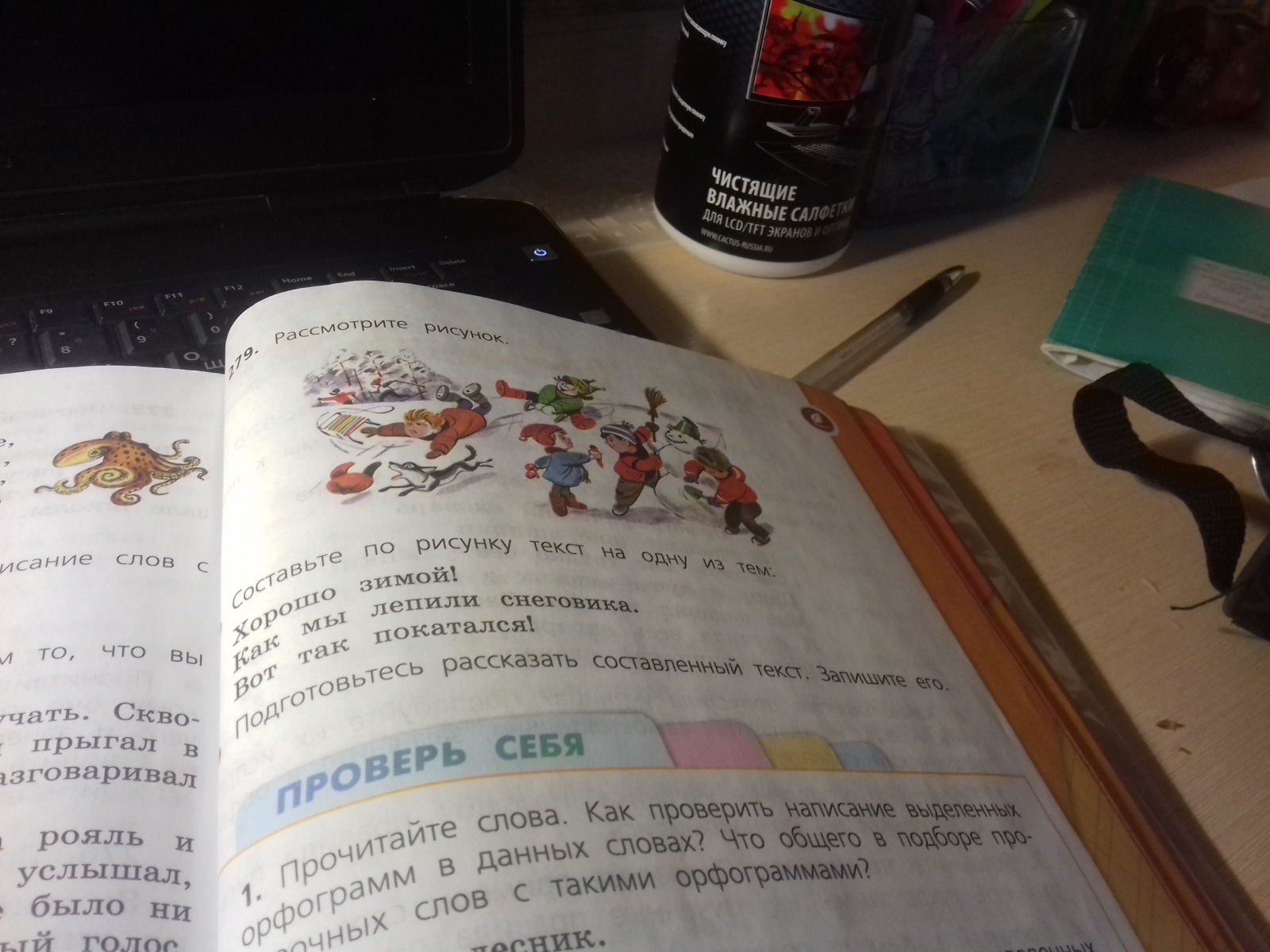 Сначала, мы слепили три шарика из снега. Потом нашли четыре палочки. Это были ручки и ножки. Взяли морковь. Это был нос. И потом надели ведро на голову и дали ему метлу. Вот такой получился снеговик!