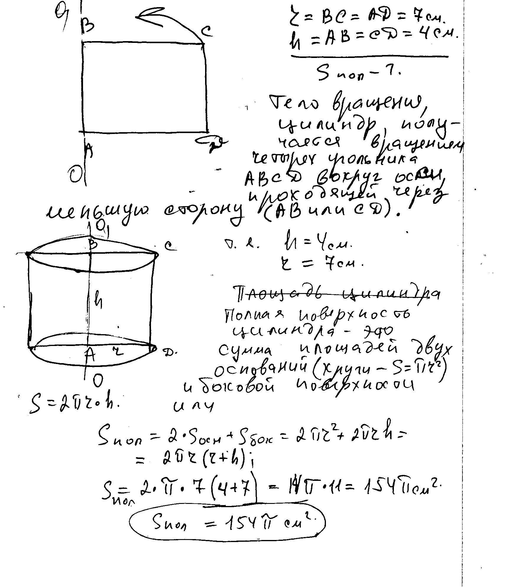 Площадь полной поверхности цилиндра, полученного вращением прямоугольника со старанами 4 см и 7 см вокруг его меньшей стороны равна