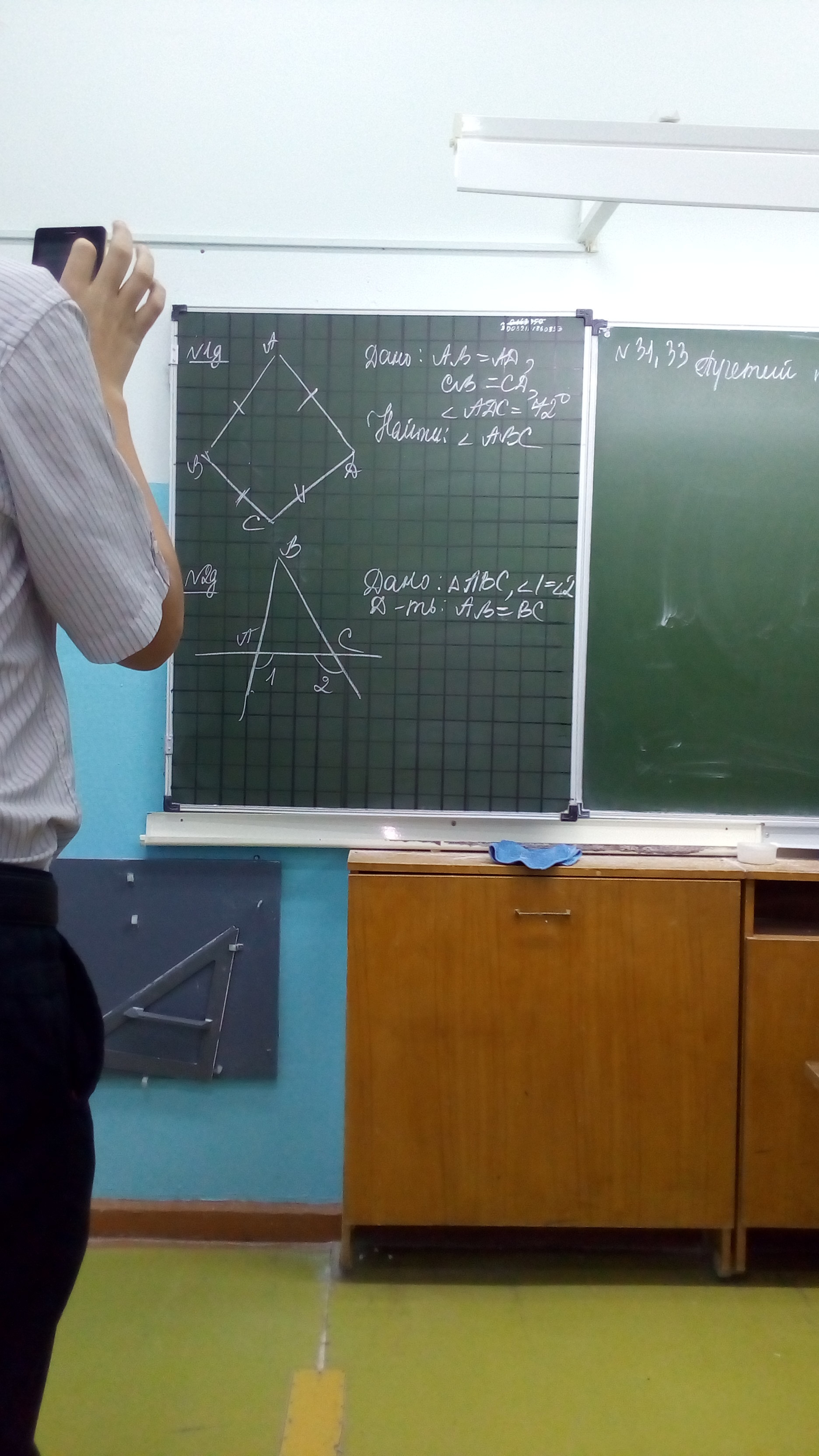 если угол 1 равен углу 2 значит их смежные углы тоже между собой равны т.е. уголВАС равен углу ВСА. По свойствам равнобедренного треугольника углы при основании равны следовательно треугольник АВС равнобедренный и АВ=ВС