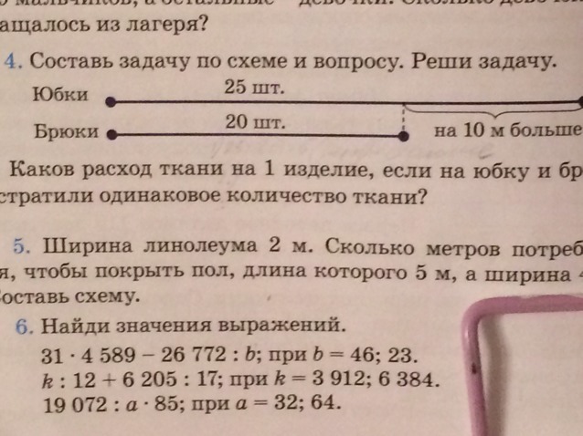 Номер:4. Каков расход ткани на 1 изделие, если на юбку и брюки истратили одинаковое количество ткани