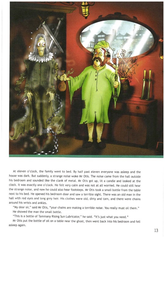 В одиннадцать часов семья легла спать. К половине двенадцатого все спали, и в доме было темно. Но вдруг мистера Отиса разбудил странный шум. Шум доносился из коридора за дверью его спальни, и звучало это как лязг цепей. Мистер Отис встал, зажёг свечу и посмотрел на часы. Был ровно час. Он был очень спокоен и совершенно не волновался. Он всё ещё слышал странный шум, но теперь он слышал ещё и шаги. Мистер Отис взял со стола рядом с кроватью маленькую бутылочку. Он открыл дверь спальни и увидел жуткое зрелище. В коридоре был старик с красными глазами и длинными седыми волосами. Его одежда была старой, грязной и порванной, а вокруг его запястьев и лодыжек были цепи.