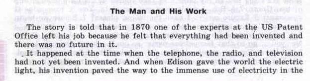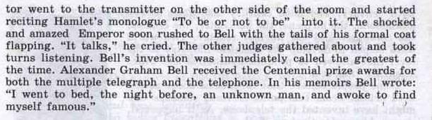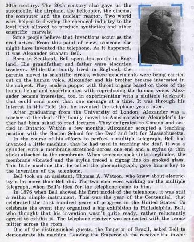 История повествует,что в 1870 году один из экспертов американского ведомства по пантентам уволился,поскольку почувствовал,что всё,что могло быть изобретено,уже изобретено,а здесь нет будущего. Это случилось в те времена,когда телефон,радио и телевидение ещё не были изобретены. И когда Эдисон подарил миру электрический свет,его изобретение проложило путь для совершенно разнообразного использования электричества в 20 веке. 20 век дал нам автомобиль,самолёт,вертолёт,кино,компьютер и ядерный реактор. Две мировые войны поспособствовали развитию химической промышленности до того уровня,который позволил производить синтетику и другие научные чудеса. Некоторые люди думают,что изобретения возникают с появлением потребности. С этой точки зрения изобрести телефон мог кто-то другой. Но это был Александр Грейам Белл. Рождённый в Шотландии,Бел провёл свою юность в Англии. Его дед и отец были преподавателями ораторского искусства. Когда семья жила в Англии,его родители вращались в таких научных кругах,в которых проводились эксперименты с человеческим голосом. Александр и его брат заинтесовались этим. Они соорудили куклу,имевшую горло,подобное человеческому,и проводили эксперименты с воспроизведением человеческого голоса. В то же время Александр заинтересовался экспериментами с множественным телеграфом,который бы мог передавать более чем одно сообщение. Именно благодаря его интересу к этой области он и изобрёл телефон несколько лет спустя. После выпуска из Лондонского университета Александр стал учителем для глухих. Семья переехала в Америку,куда отца Александра пригласили читать лекции. Они эмигрировали в Канаду и осели в Онтарио. За три месяца Александр был принят на ставку учителя в Бостонской школе глухих и уехал в Массачусетс. В череде своих попыток усовершенствовать свой множественный телеграф Белл изобрёл маленькую машинку,использовавшуюся при обучении глухих. Это был цилиндр с мембраной,натянутой на одном конце,и стилусом (тонкой палочкой),прикреплённым к мембране. Когда кто-то говорил в цилиндр,мембрана вибрировала и стилус рисовал зигзаги на закопчёном стекле. Маленькая машинка,которую он назвал фоноавтографом,дала ему ключ к изобретению телефона. Белл взял ассистента,Томаса А. Уотсона,который знал об электричестве гораздо больше,чем Белл. Над идеей множественного телеграфа работало уже двое,когда к Беллу пришла идея телефона. В 1876 году,когда Белл показывал свою первую модель телефона,это был ещё довольно простой инструмент. Это был год столетия Дня независимости,который праздновался по поводу первых ста лет прогресса в США. Чтобы отпраздновать это событие,в Филадельфии была организована большая выставка. Белл,думавший что его изобретение ещё не до конца готово,всё-таки неохотно согласился продемонстрировать его. Телефонный приёмник был соединён с передатчиком в другом конце комнаты. Один из выдающихся гостей,император Бразилии,попросил Белла продемонстрировать свою машину. Оставив императора у приёмника,изобретатель отпрвился к передатчику на другом конце комнаты и начал читать монолог Гамлета "Быть или не быть". Шокированный и восхищённый император вскоре помчался к Беллу,развевая фалдами своего костюма. "Оно говорит!",орал он. Другие судьи собрались и стали слушать. Изобретение Белла тотчас было назв