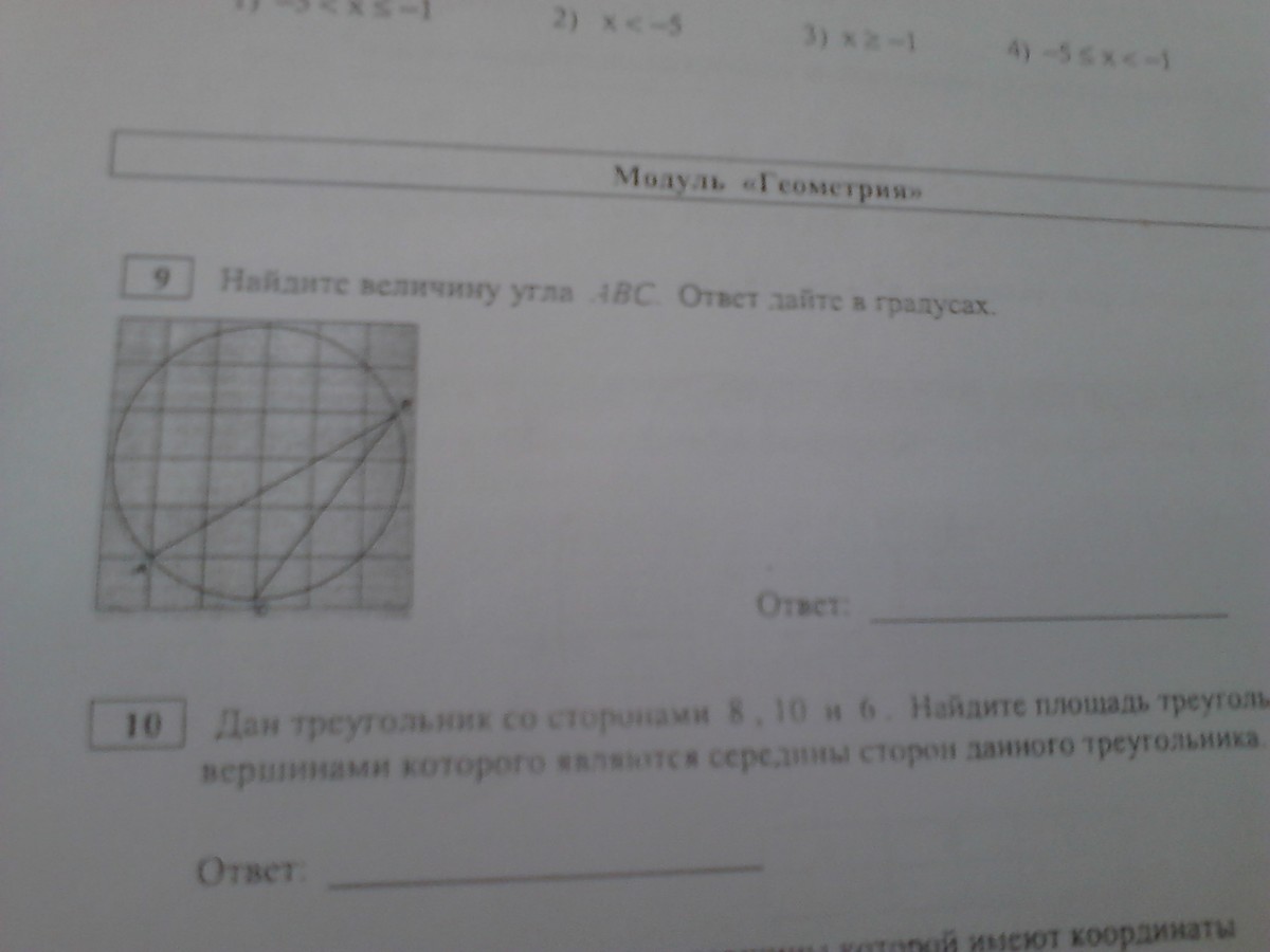 2 клетки=45 градусов,вписаный угол равен половине дуге на которую он опирается,угол АВС=22,5 градусов.