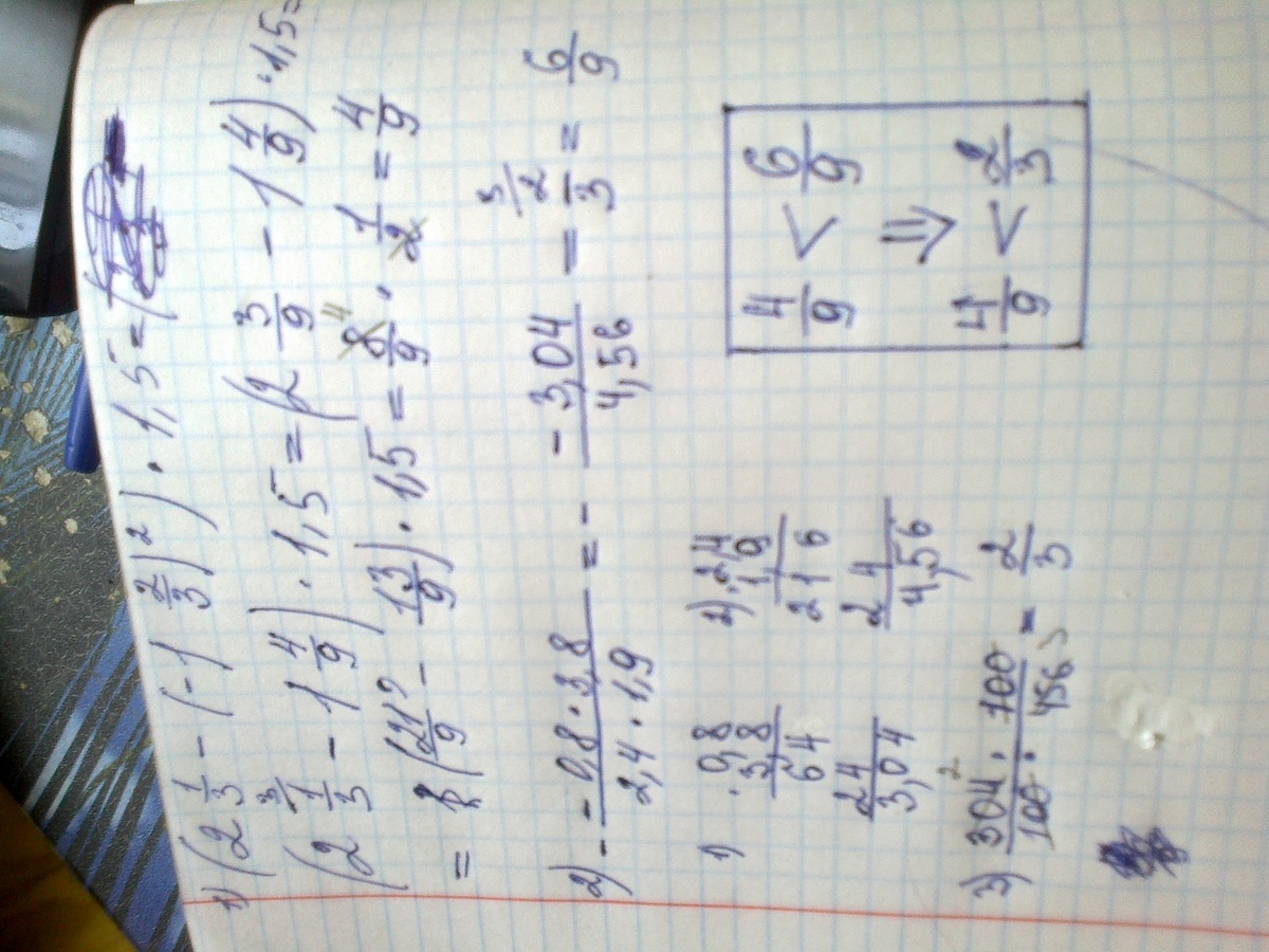 (2 целых 1/3-(-1 целая 2/3 в квадрате))*1,5 и - 0,8*3,8 и под этой строчкой ещё одна 2,4*1,9 и минус по середине