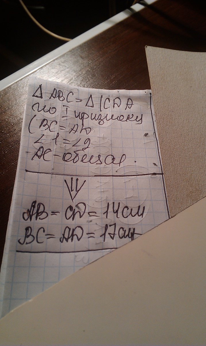 на рисунке 43 BC=AD, <1=<2.1)докажите,что треугольник ABC=треугольнику CDA:2)Найдите AB иBC,если AD=17 см,DC=14 см
