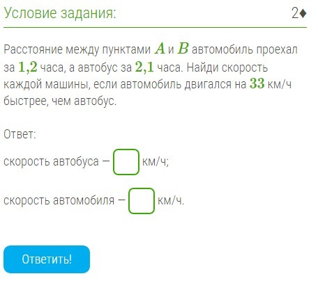 Скорость автобуса-60 км/ч.Скорость автомобиля-83 км/ч