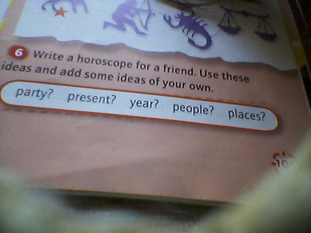 А что тебе не понятно? Составь, конечно, лучше сама. Надо составить гороскоп своему другу по предложенным идеям (праздник, подарок, год, люди , места) или по своим идеям (кошелек с деньгами ахаха) пример: On Мonday Mary will meet a new friend (в понедельник Маша встретит нового друга) или On Tuesday Andrew,s (запятая сверху) friend will invite him to a cool party (во вторник друг Андрея пригласит его на крутую вечеринку) а еще