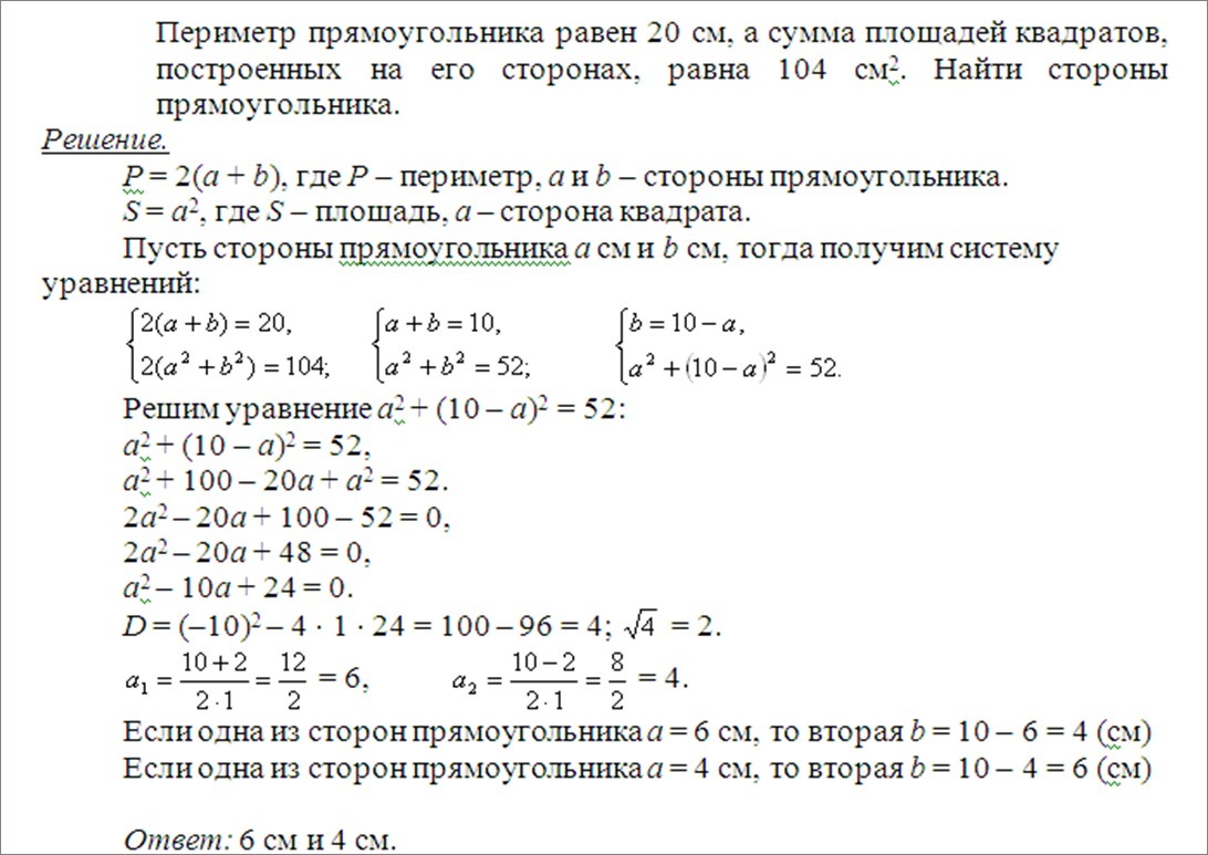 Периметр прямоугольника равен 20 см, а сумма площадей квадратов, построенных на его сторонах, равна 104 м2. Найти стороны прямоугольника.
