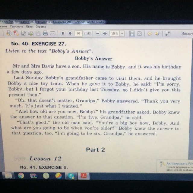 О это не имеет значения дедушка, ответил Бобби . Спасибо большое . Это было то что я хочу . Сколько тебе лет сейчас Бобби ? его дедушка спросил. Бобби знал ответ на этот вопрос. Мне 5 дедушка сказал он. Это хорошо ответил старый человек .Ты большой мальчик сейчас, Бобби . И сколько тебе лет будет потом? Бобби тоже знал ответ на этот вопрос. Мне будет 6. ответил он.