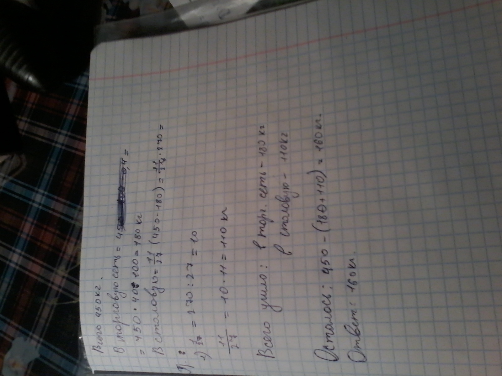 Пекарня выпекает в день 450 кг хлеба . В торговую сеть идет 40 % всего хлеба , а в столовые 11/27 ( дробь ) остаткка . Сколько кг хлеба осталось в пекарни