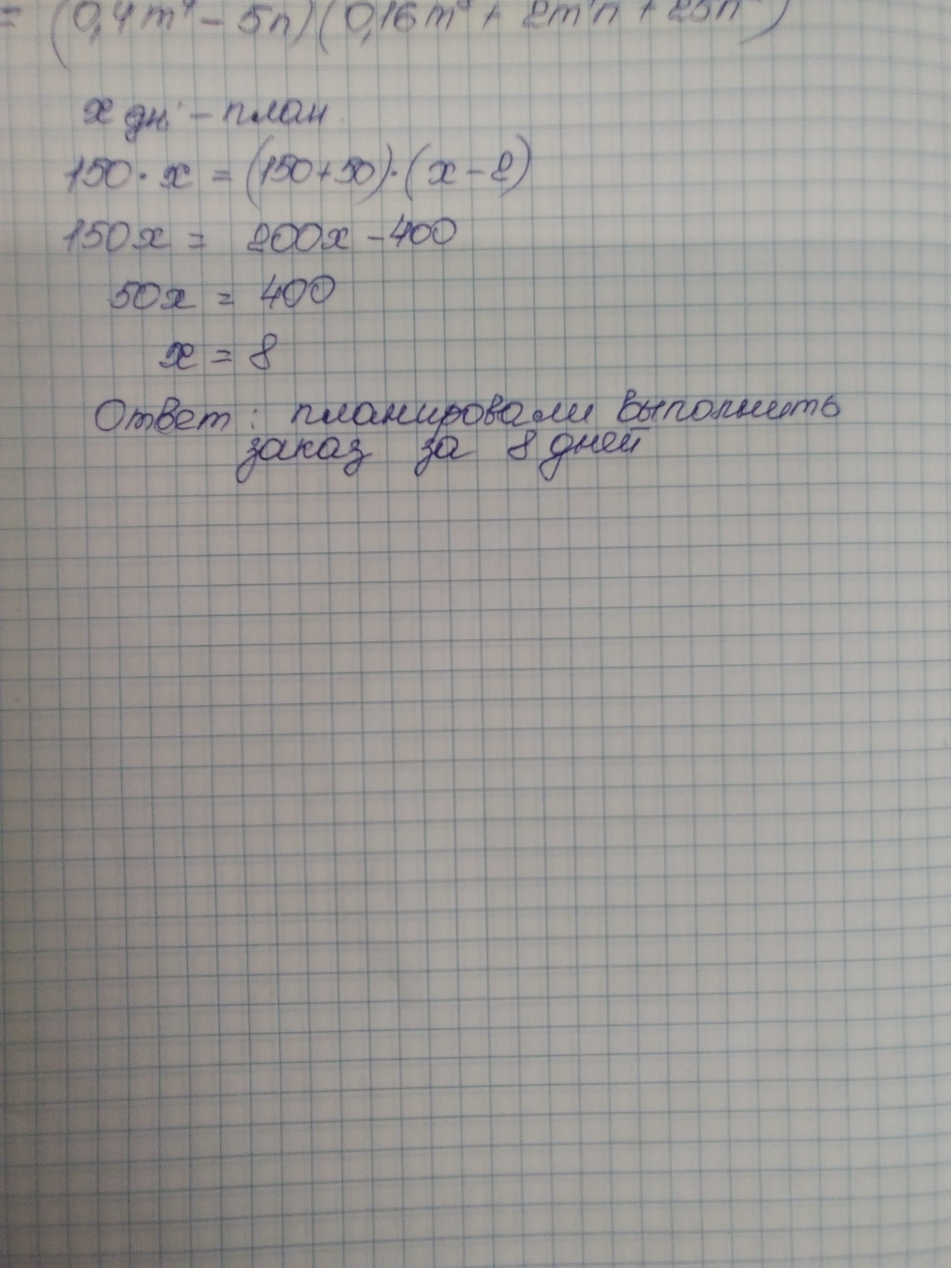 Для того чтобы выполнить задание в срок, мастерская должна была изготавливать ежедневно по 150 изделий, но она изготавливала в день на 50 изделий больше и потому выполнила задание за два дня до срока. За сколько дней планировала мастерская выполнить задание первоначально? Заранее спасибо