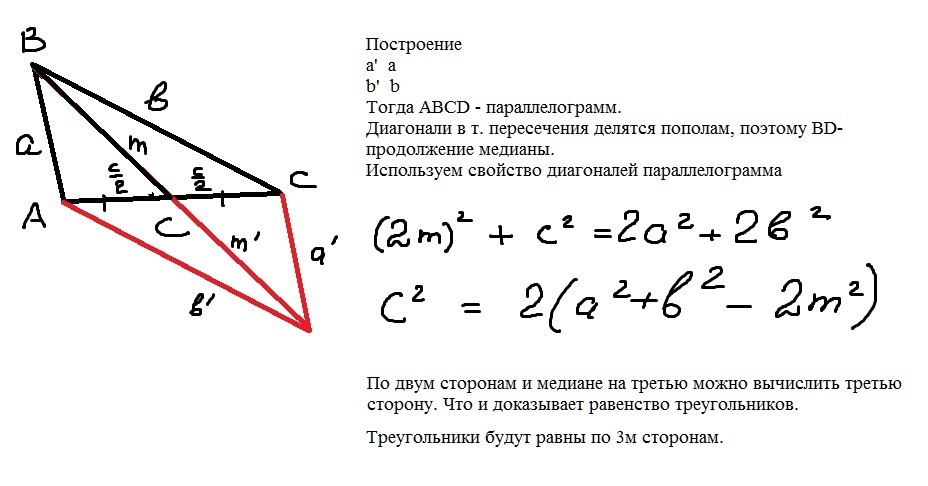 Докажем, что по двум сторонам и медиане на третью можно вычислить третью сторону Тогда у обоих треугольников будет по 3 равных стороны
