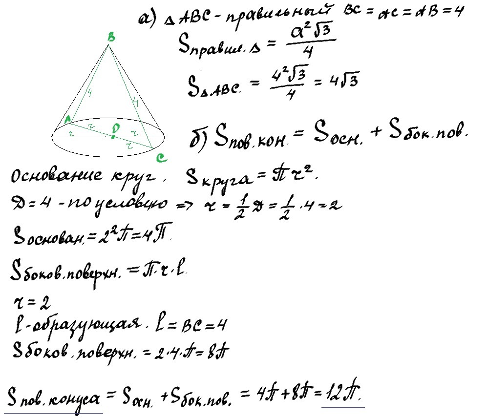 1. Осевое сечение конуса - правильный треугольник со стороной 4 см. Найдите: а) площадь осевого сечения этого конуса; б) площадь полной поверхности конуса