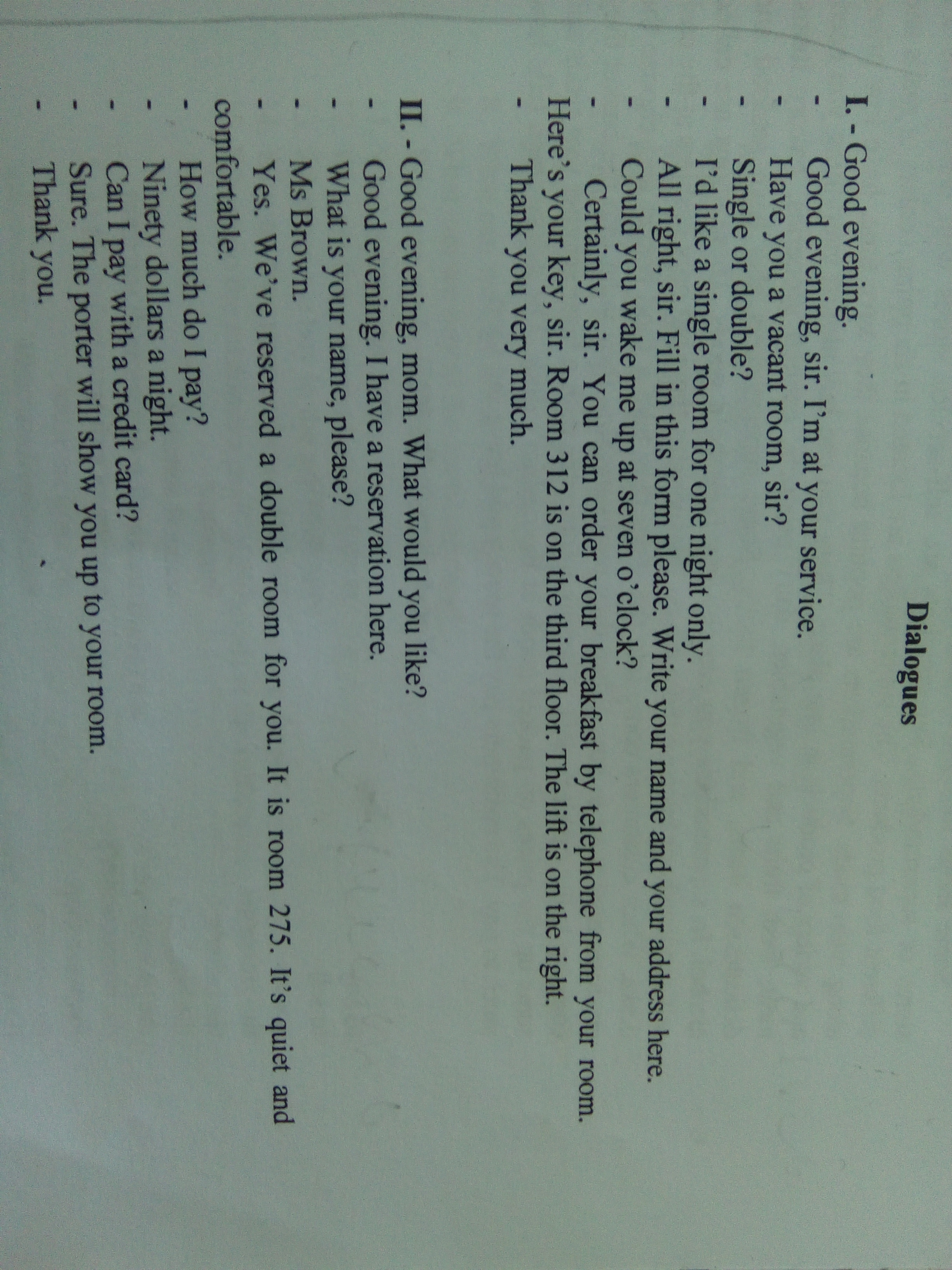 2. добрый вечер. что желаете ? добрый вечер я забронировала здесь. ваше имя пожалуйста. мис браун. да мы забронировали для вас двухместную комнату . комната 275. тихая и удобная. сколько я должна заплатить. 19 долларов за ночь . могу я заплатить кредитной картой. конечно. портье покажет вашу комнату. спасибо