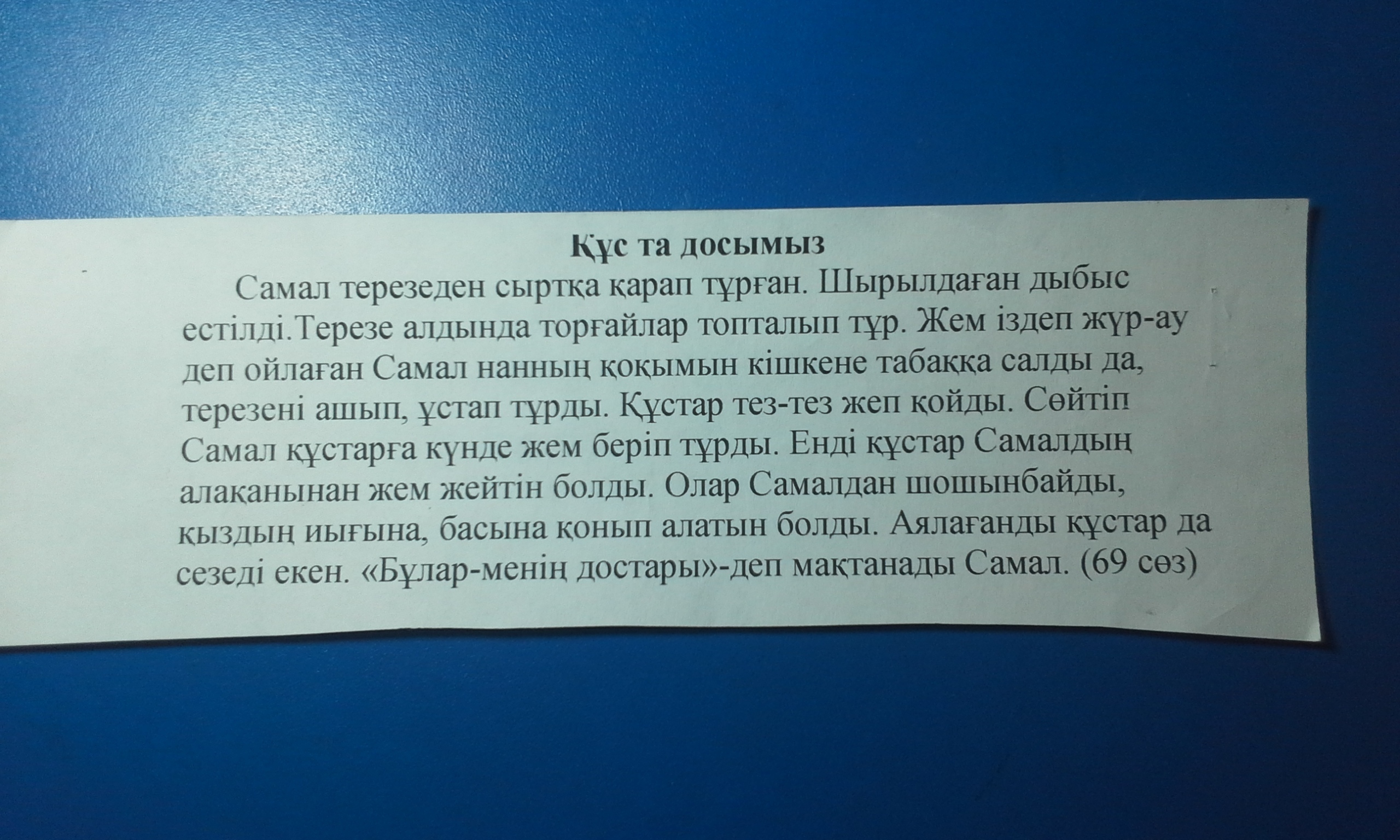 Самал смотрела в окно и вдруг вышел скрипучей звук перед окном птицы сидят Самал думала они ищут пищу и она дала им крошки хлеба Птицы все склевали и так Самал каждый день давала им крошки хлеба теперь птицы едят с рук Самал и они не боялись Ее и ночевали у неё на голове и на плече птицы тоже мерзнут Самал начала хвастаться "они мои друзья"