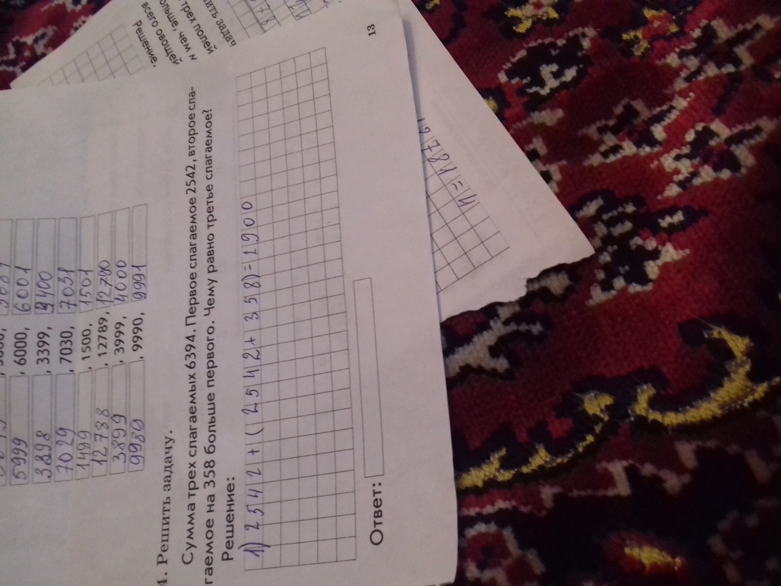 сумма 3 слагаемых 6394. 1 слагаемое 2542, второе слагаемое на 358 больше первого.Чему равно 3 слагаемое?