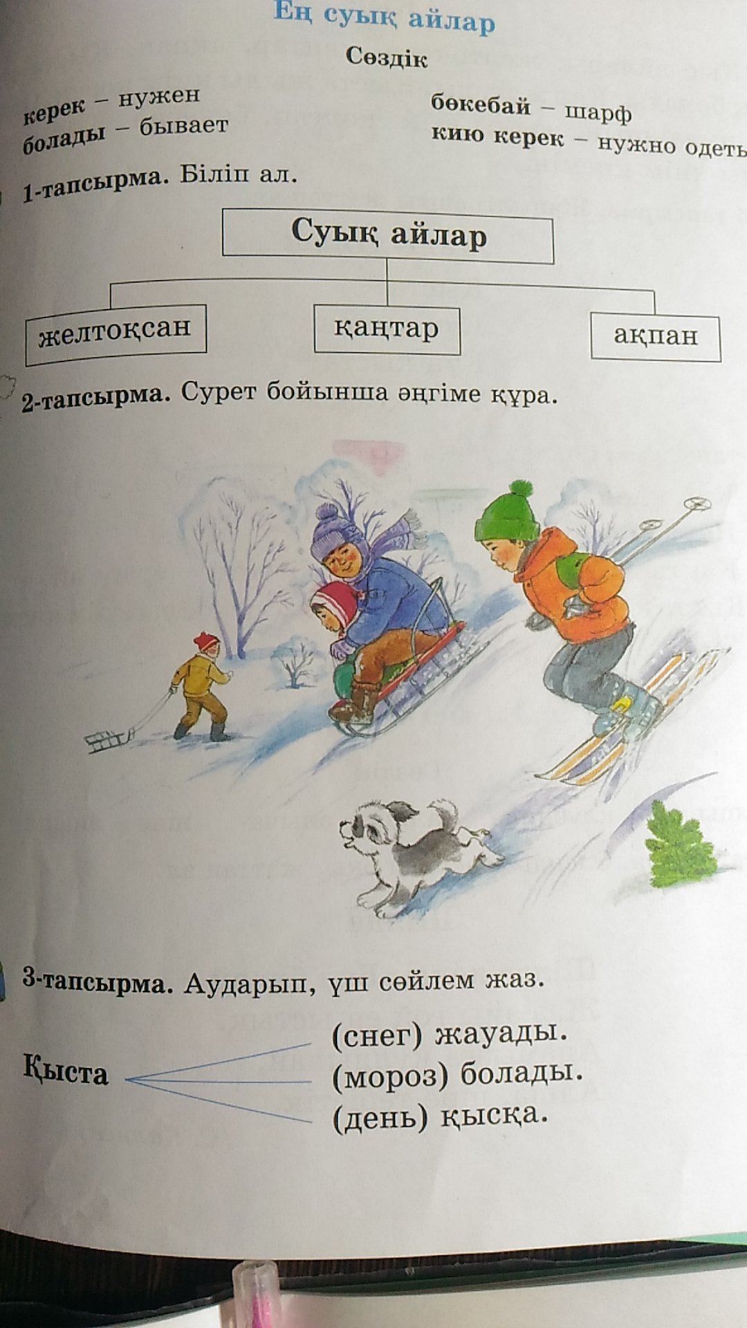 балалар шаңғы теуіп жүр. Олар өте көңілді.Біреуі шана екіншісі шаңғымен ойнап отыр. Осылай балалар керемет ойнады