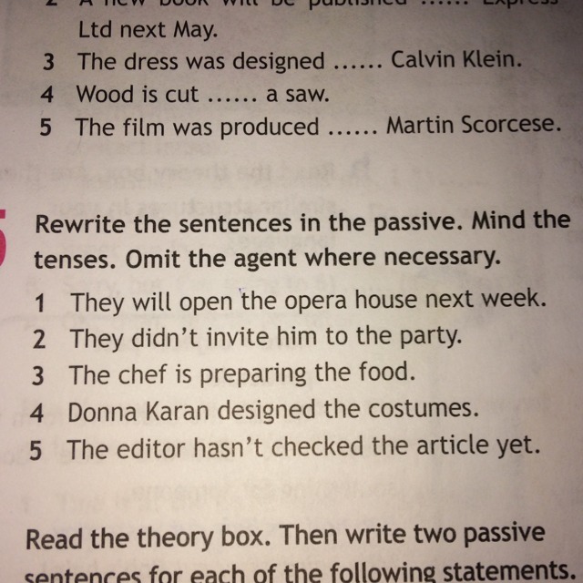 Перепишите предложения в пассивном. Разум в напрягается. Опустим агента, где это необходимо. 1 Они откроют оперный театр на следующей неделе. 2 Они не пригласить его на вечеринку. 3 Шеф-повар готовит пищу. 4 Донна Каран разработала костюмы. 5 Редактор не проверил эту статью еще.