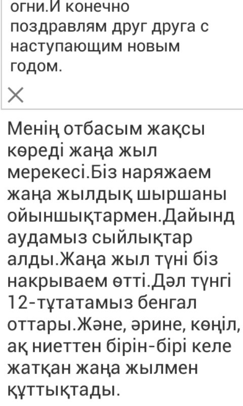 меңің отбасым жаңа жылды жаксы кореді. Біз шыршаны жаңа жыл ойыншыктарымен безендіреміз. қонақтарга сыйлықтар дайындаймыз .Біз жаңа жылда устел жайамыз.Сағат тура 12 де біз бенгаль отын жагамыз .Жэнеде бір бірімізді жаңа жылмен куттыктаймыз !!! это правильно я делала мне 5 поставили