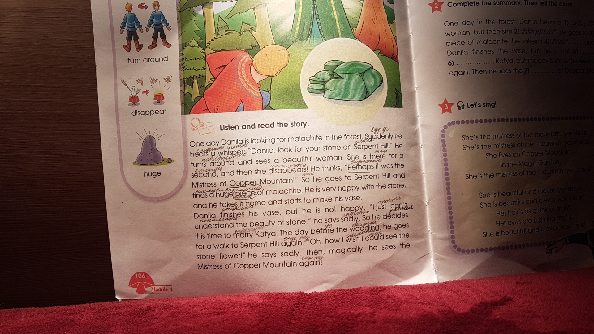 Однажды Данила ищет малахита в лесу. Вдруг он слышит шепот: "Данила, посмотри на свой камень Змея на холме". Он оборачивается и видит красивую женщину. Она есть на секунду, а потом она исчезает! Он думает, что "возможно, это была хозяйка медной горы. Поэтому он идет на Змеиный холм и находит огромный кусок малахита. Он очень счастлив с камнем и он берет его домой и начинает делать свою вазу.