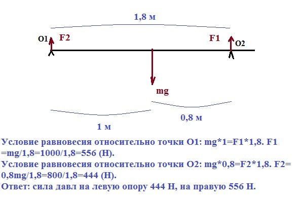Рельс массой 100 кг и длинной 2 м находится на двух опорах. Определите силу давления рельсы на опоры, если одна опора находилась на расстоянии 20 см от одного из концов рельса.