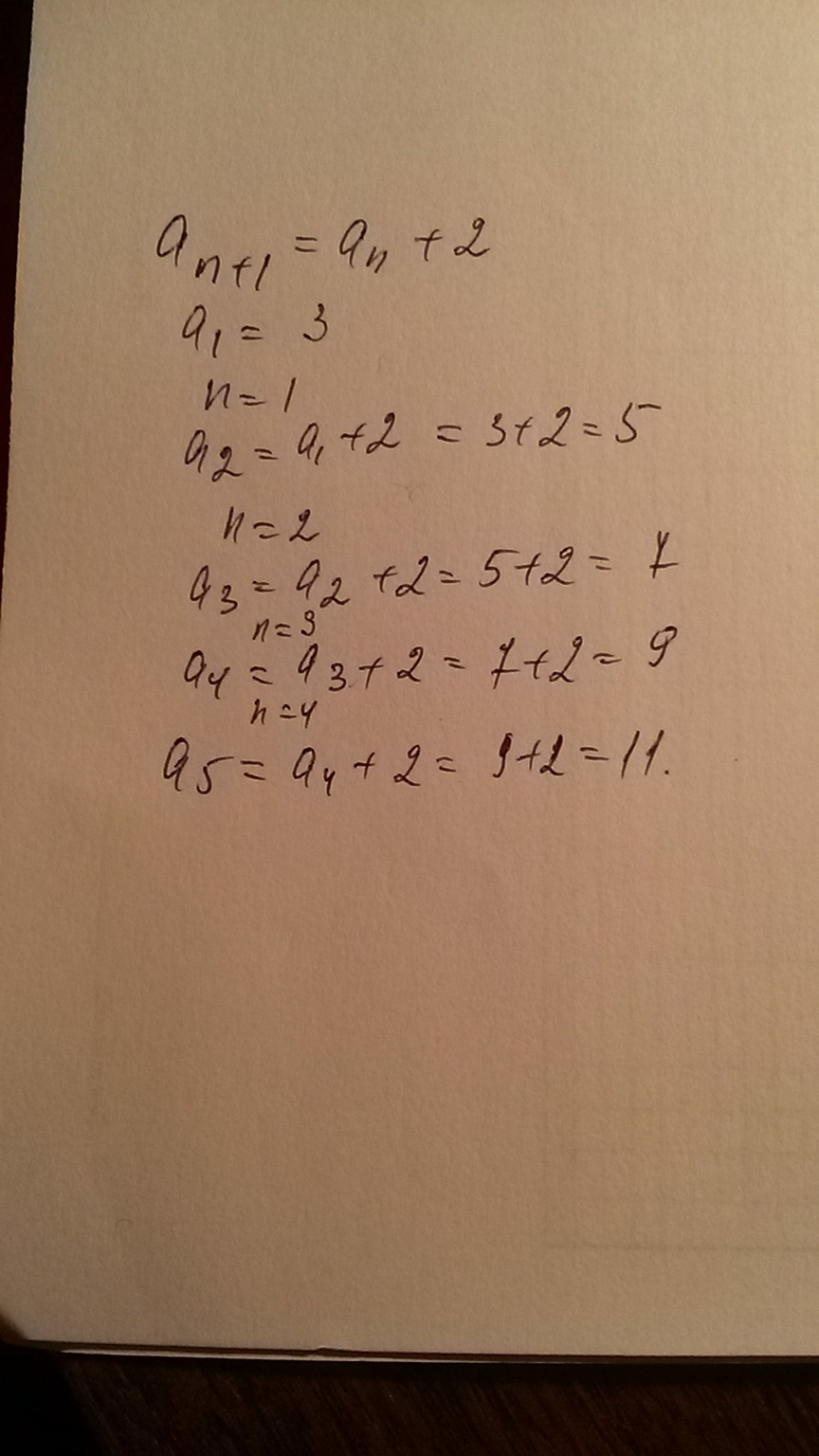 арифметическая прогрессия(а..) задана формулой n-го члена а n+1=an+2 и известно,что а1=3.Найдите пятый член этой прогрессии