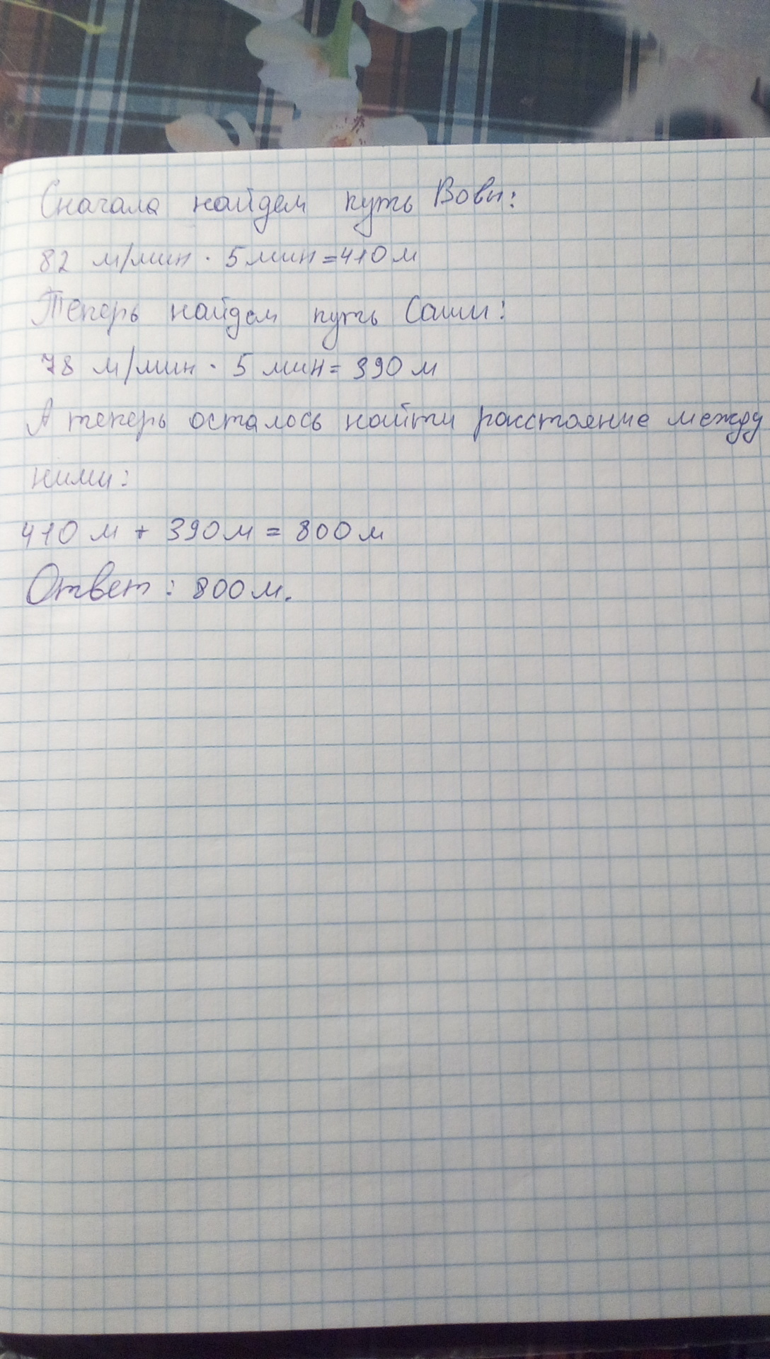 вова встретил своиго друга .они поговарили и пошли дальше в противоположных направлениях.вова шел со скоростью 82 м/мин, а саша 78м/мин.на каком расстоянии друг от друга окажутся мальчики через 5 минут?