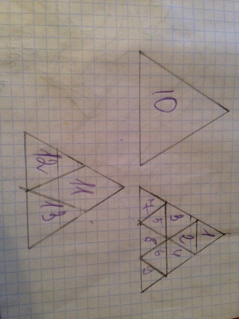Я 13 нашел, сначала ты считаешь все треугольники внутри. Их 9. Один самый большой треугольник, итого 10. И еще средние. Итого 13. Рисунок быстро нарисовал, но в целом понятно.