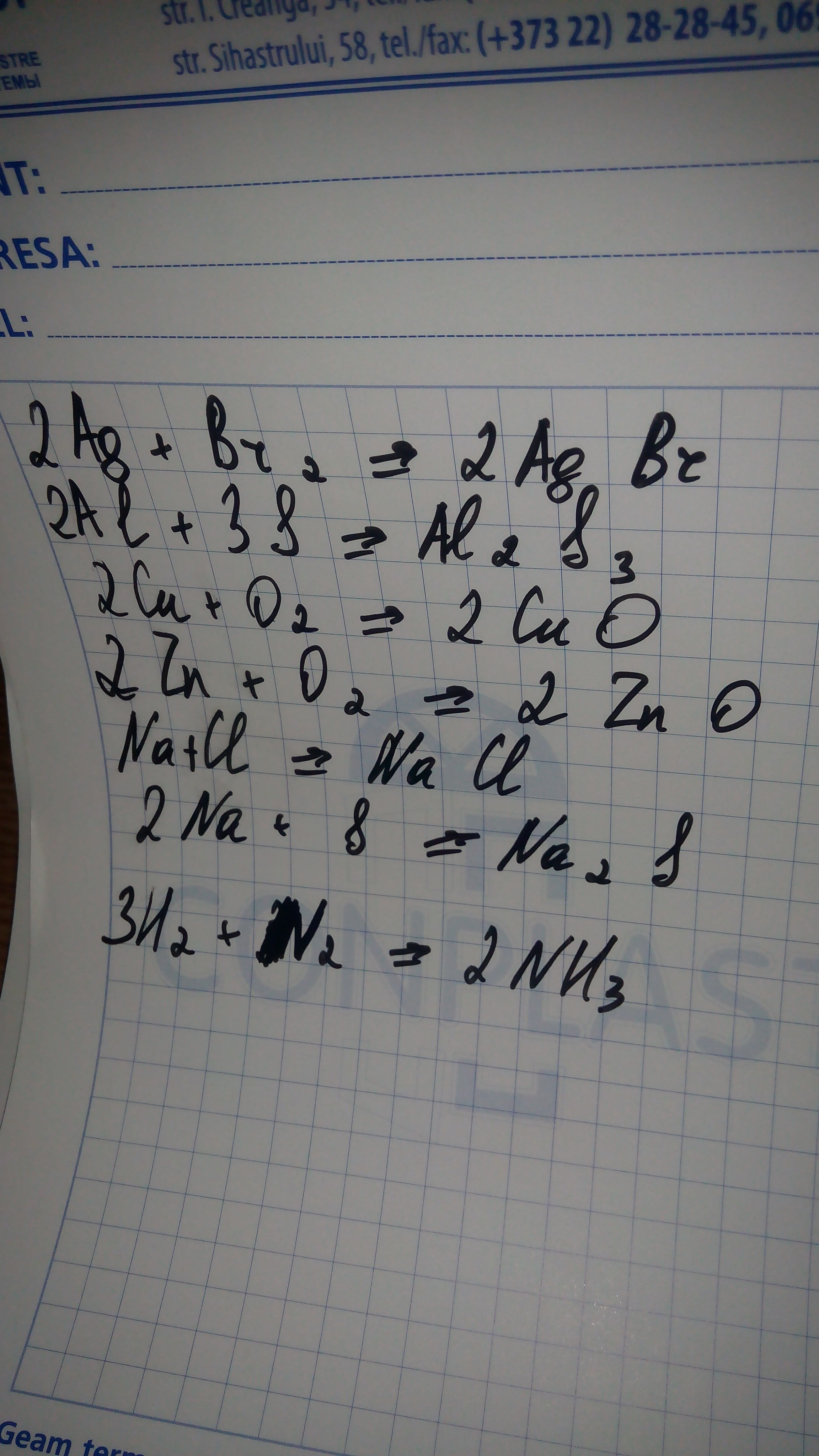 разставь коефициенты по схемах AgBr-> Ag + Br2 . A1 + S - > A12S3 . Cu + O2 -> CuO . Zn + O2 -> ZnO . Na + C1 - > NaCi . Na + S - > Na2S. H2 + N2 - > NH3.