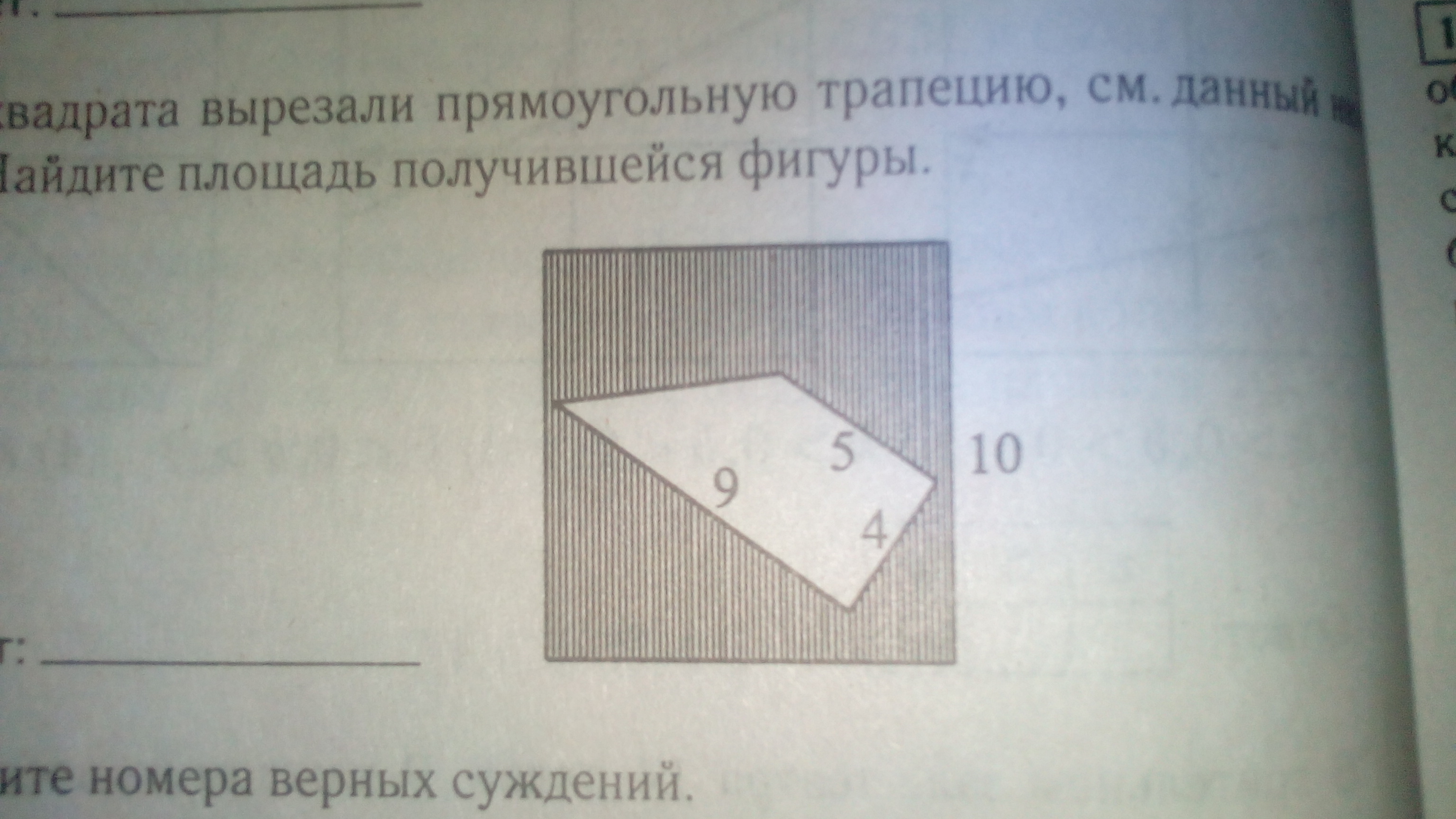 Из квадрата вырезали прямоугольник (см. рисунок).Найдите площадь получившейся фигуры?