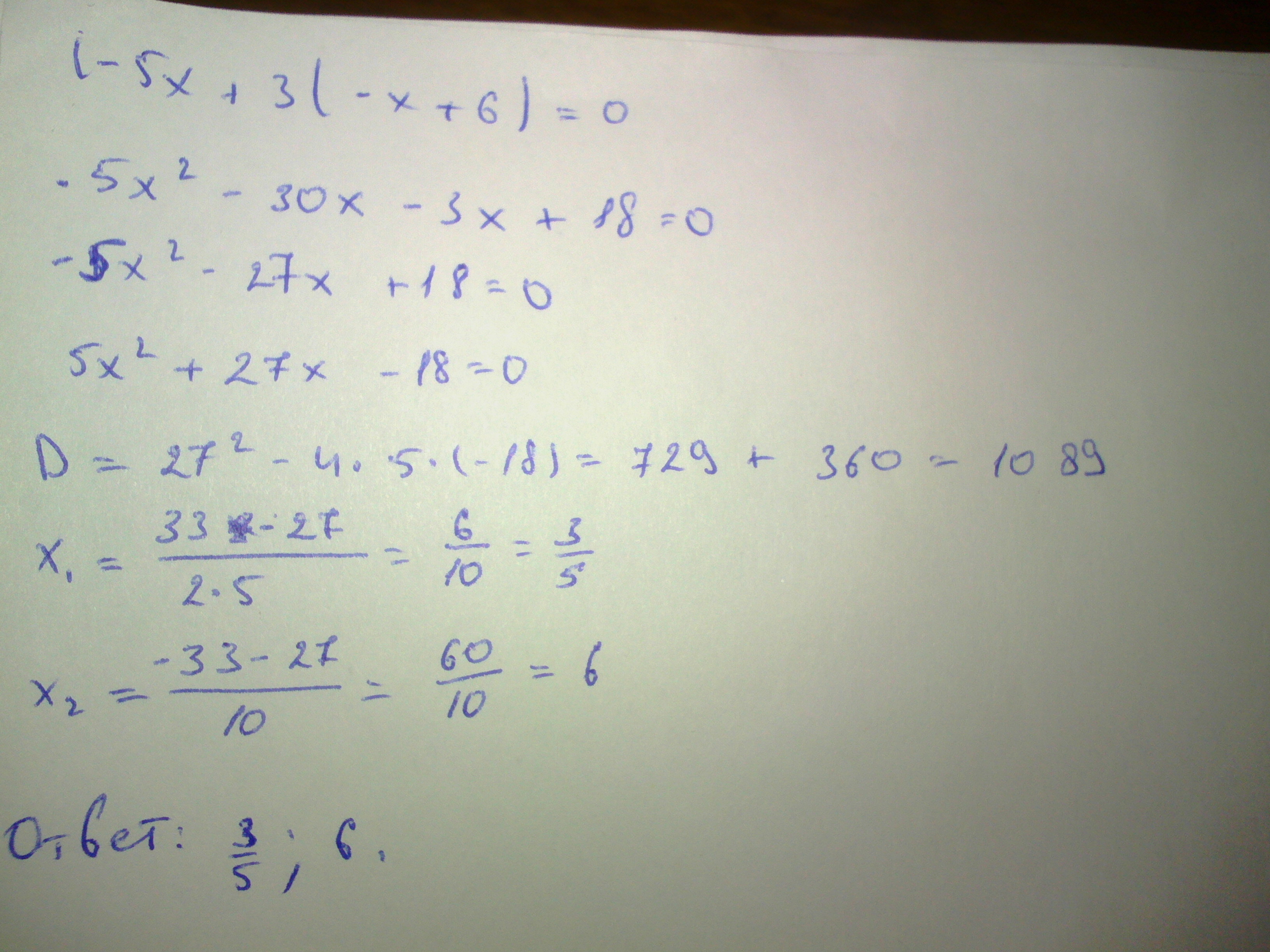 Решите уравнение : (- 5х + 3)(- х + 6) = 0