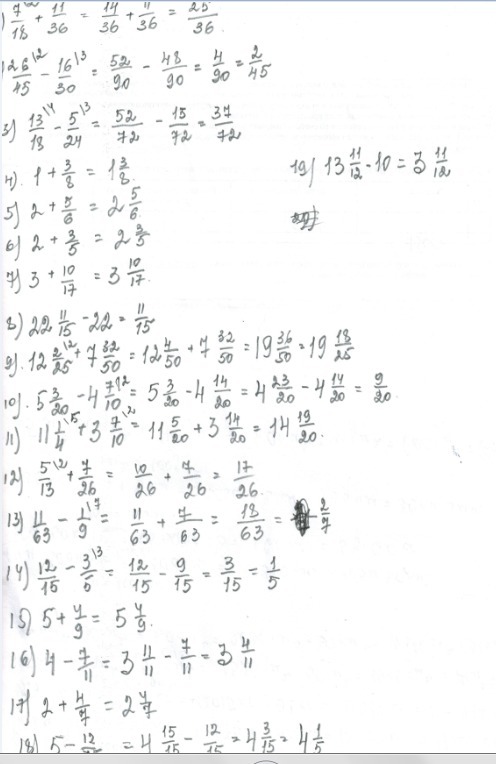 выполните сложение или вычитание 7/18+11/36, 26/45-16/30, 13/18-5/24, 1+3/8, 2+5/6, 2+3/5, 3+10/17, 22 11/15-22, 12 2/25+7 32/50, 5 3/20-4 7/10, 11 1/4+3 7/10, 5/13+7/26, 11/63-1/9,12/15-3/5, 5+4/9,4-7/11, 2+4/7, 5-12/15, 13 11/12-10, 15 7/24+8 1/3, 4 4/15-2 1/30, 12 1/5+2 5/10, 7/12+4/36, 15/27-1/9, 11/14-17, 4+2/7, 5-4/9, 6+2/3,10+15/21, 15 1/7-5, 16 2/9+2 1/18, 3 4/17-2 1/34, 14 2/3+3 4/15