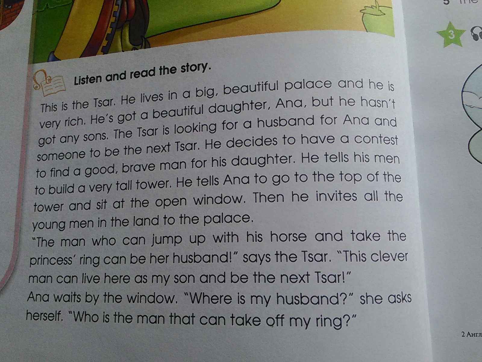 Это Царь. Он живет в большом, красивом дворце и оночень богат. У него есть красивая дочь Анна, но нет у него сыновей. Царь ищет мужа для Анны, человекакоторый в будущем станет новым царем. Он решает устроить соревнование, чтобы найти хоро-шего, смелого мужчину для своей дочери. Он приказываетсвоим слугам построить очень высокую башню. Он проситАнну подняться на верх башни и сидеть перед открытым окном. Затем он приглашает всех молодых людей страны водворец. "Человек который может прыгнуть на коне и снять кольцо с руки принцессы, станет её мужем" -- сказал Царь. "Этот ловкий человек будет жить во дворце и станет мне сыном. Он будет следующим царём". Анна ждет у окна. "Где мой муж?" -- спрашивает она себя. "Кто тот мужчина что сможет достать кольцо?".