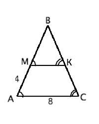 Объяснение: МК║АС, АВ- секущая, ВС - секущая. Соответственные углы при пересечении параллельных прямых секущей равны, ⇒ ∆ АВС~∆ МВК. По условию МК=АМ=4, АС=8, ⇒ k=AC:МК=8:4=2.