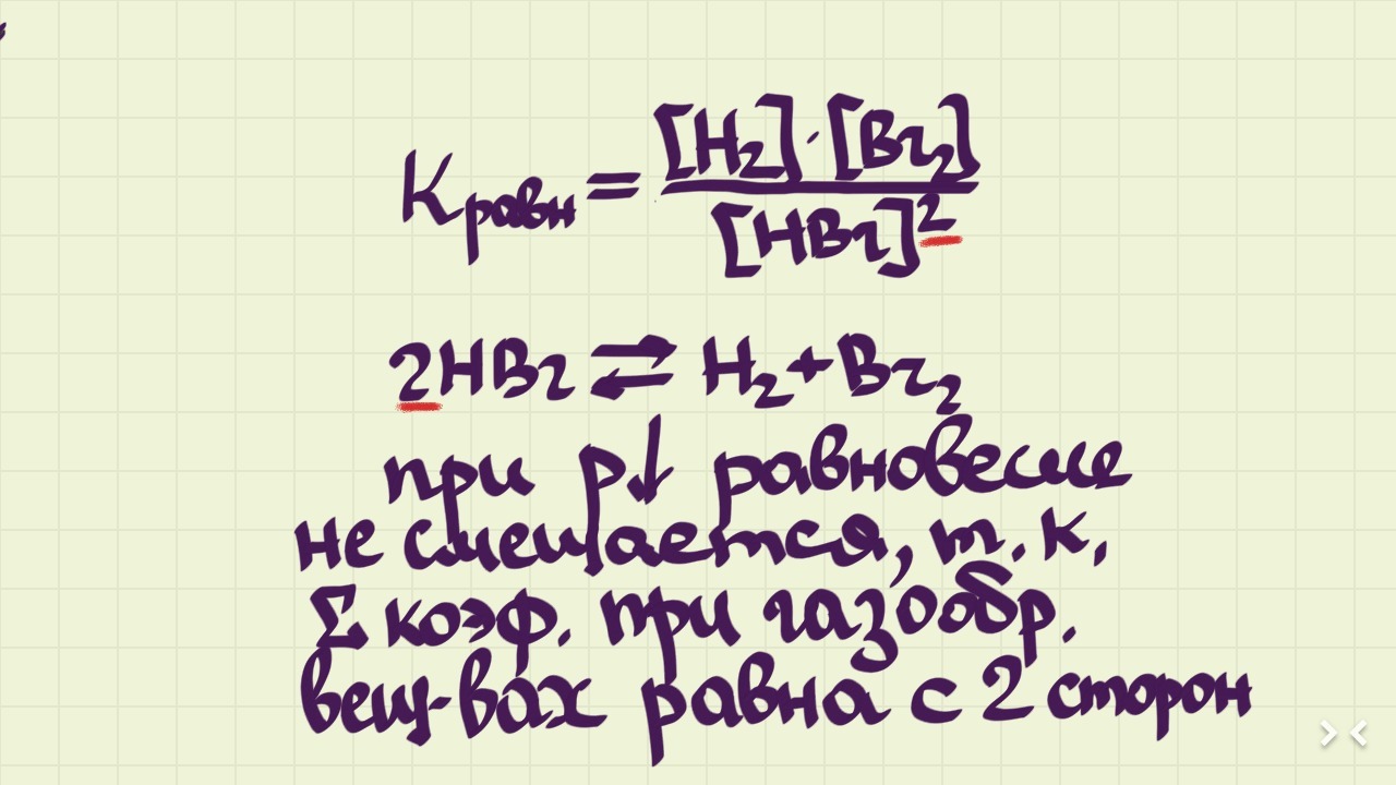 Смещение химического равновесия при понижении давления 2HBr(г) ↔ H2(г) + Br2(г) напишите выражение константы равновесия реакции