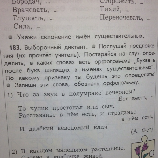 выборочный диктант. послушай предложения (их прочтет учитель). постарайся на слух определить в каких словах есть орфограмма "буква ь после букв щипящих в существительных".