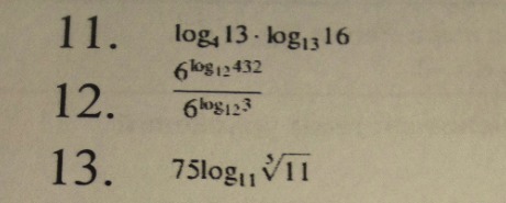 1)quad log_413cdot log_{13}16= frac{log_213}{log_24}cdot frac{log_216}{log_213} = frac{log_22^4}{log_22^2} =frac{4}{2}=2\\ili\\log_413cdot log_{13}16=log_413cdot frac{1}{log_{16}13}= frac{log_{4}13}{log_{4^2}13}= frac{log_413}{frac{1}{2}log_413} = frac{2cdot log_413}{log_413} =2\\2)quad  frac{6^{log_{12}432}}{6^{log_{12}3}} =6^{log_{12}432-log_123}=6^{log_{12}frac{432}{3}}=6^{log_{12}144}=6^{log_{12}12^2}=\\=6^{2log_{12}12}=6^2=36