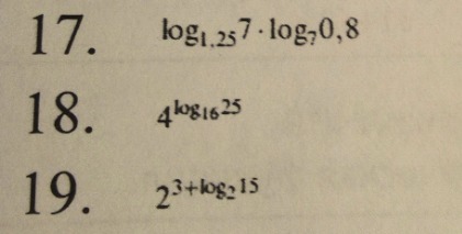 log_{1,25}7cdot log_{7}0,8=log_{5/4}7cdot log_7frac{4}{5}=frac{1}{log_7frac{5}{4}}cdot log_7(frac{5}{4})^{-1}=\\=frac{1}{log_7frac{5}{4}}cdot (-log_7frac{5}{4})=-1\\\4^{log_{16}25}=4^{frac{1}{2}log_45^2}=4^{log_45}=5\\\2^{3+log_215}=2^3cdot 2^{log_215}=8cdot 15=120