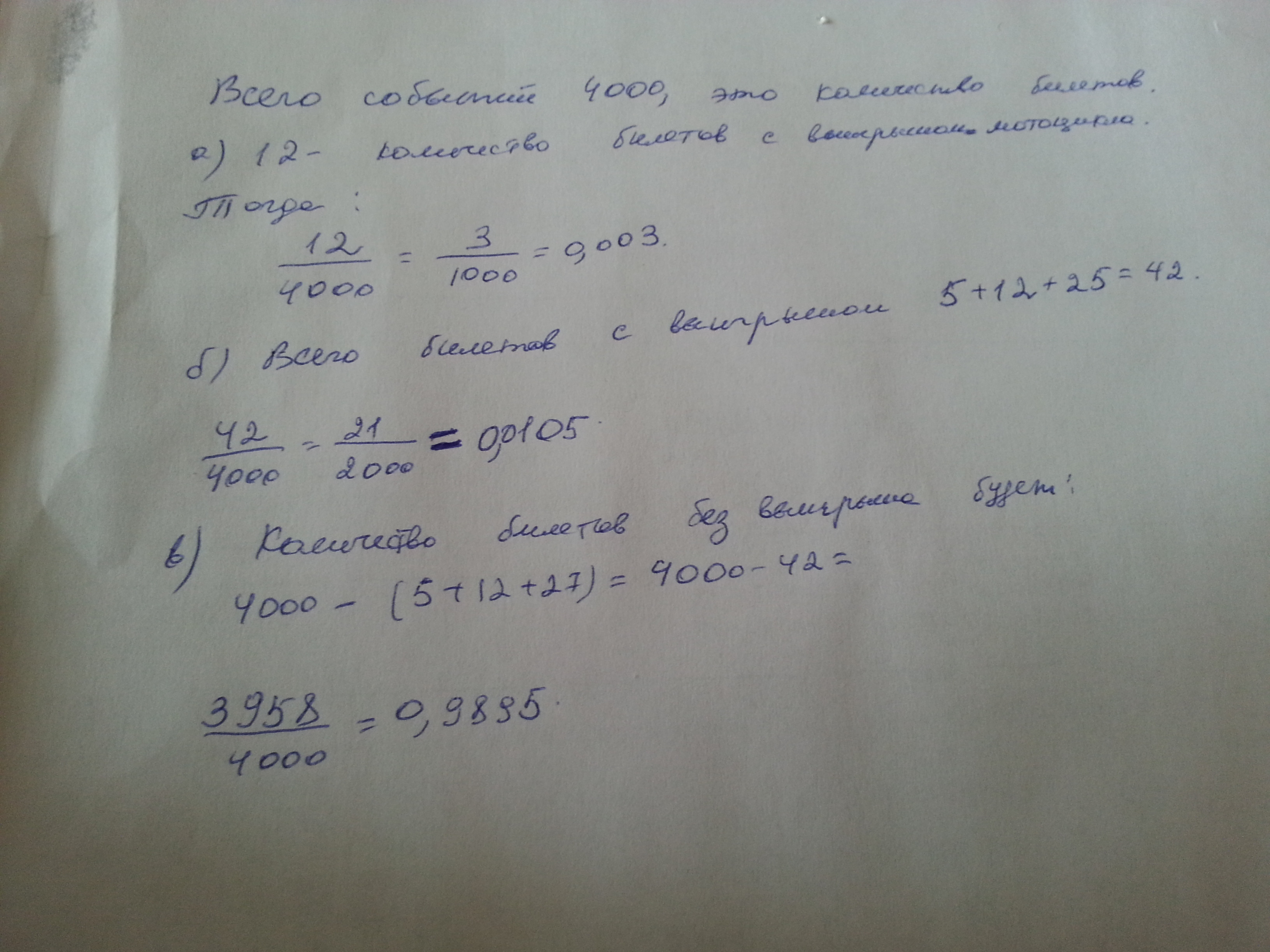 в лотерее разыгрывалось 5 автомобилей , 12 мотоциклов 25 телевизоров. всего было выпущено 4000 билетов какова вероятность 1)выйграть мотоцикл 2)какой-либо приз 3)не выйграть нечего